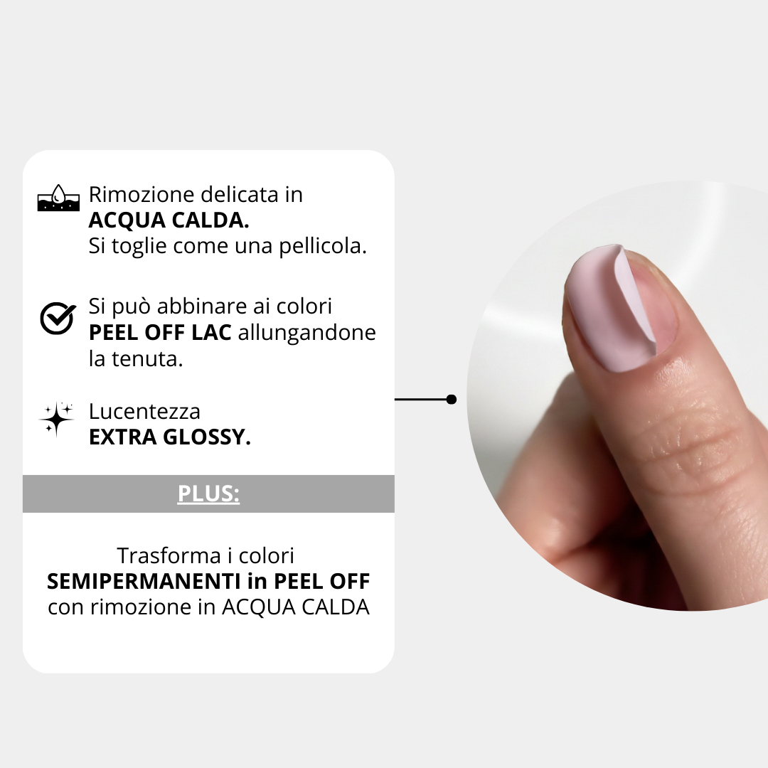 La Base & top que transforma todos los esmaltes semipermanentes clásicos en esmaltes Peel Off Lac, es decir, con la característica de poder ser removidos delicadamente en agua caliente en pocos minutos.