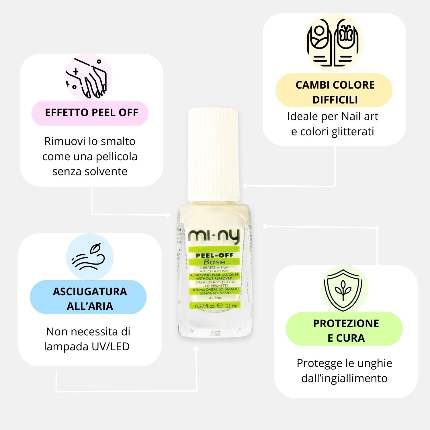 - Applicare uno strato di PEEL-OFF BASE sull'unghia priva di smalto Lasciare asciugare circa 10 minuti fino a che la pellicola diventa trasparente