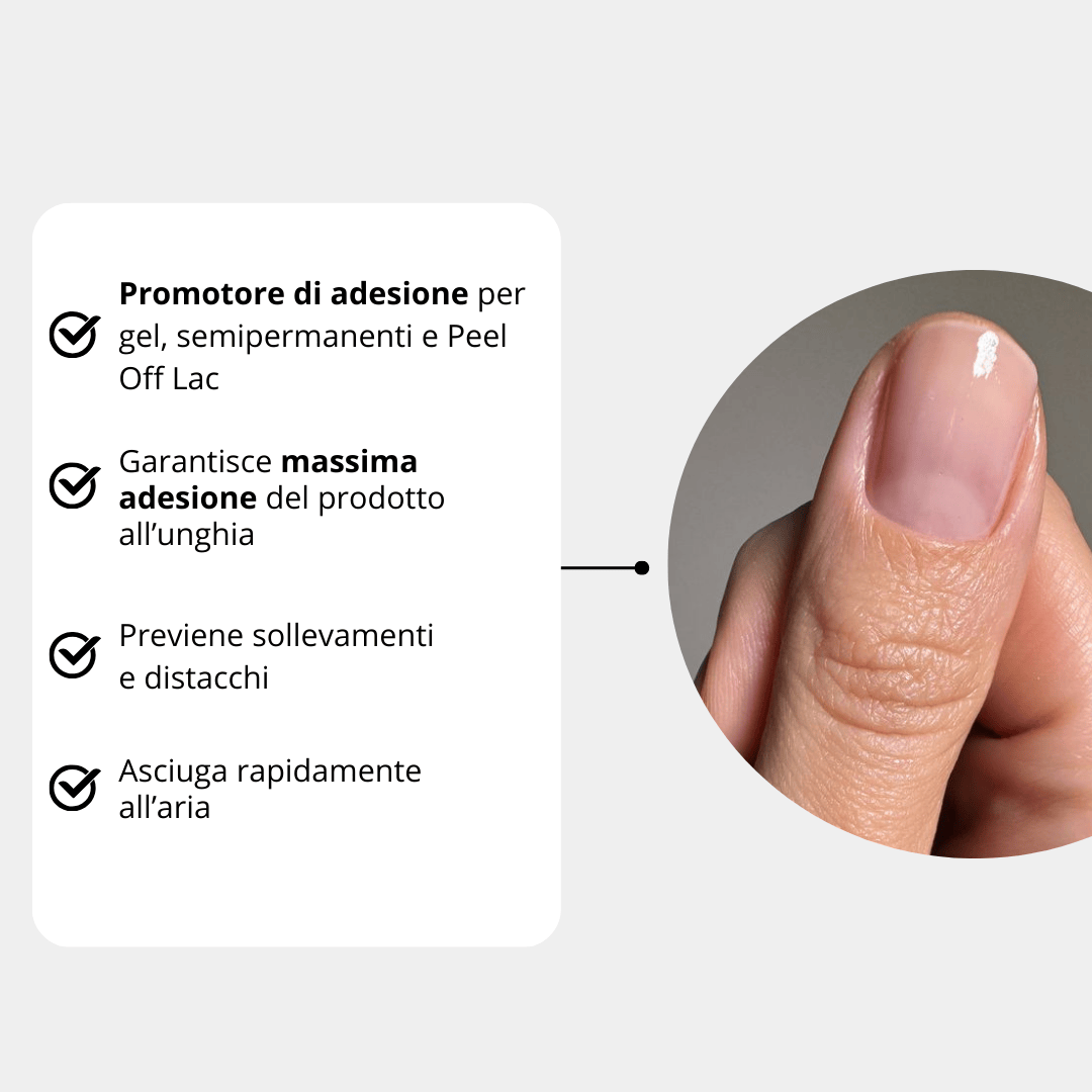 Il Primer è un promotore di adesione, dopo aver opacizzato accuratamente l'unghia, stendere uno strato sottile di Primer e lasciar asciugare per 60 sec all'aria.